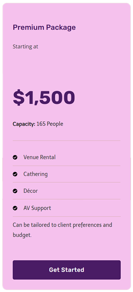Covers: Venue Rental + Cathering + Décor + AV Support